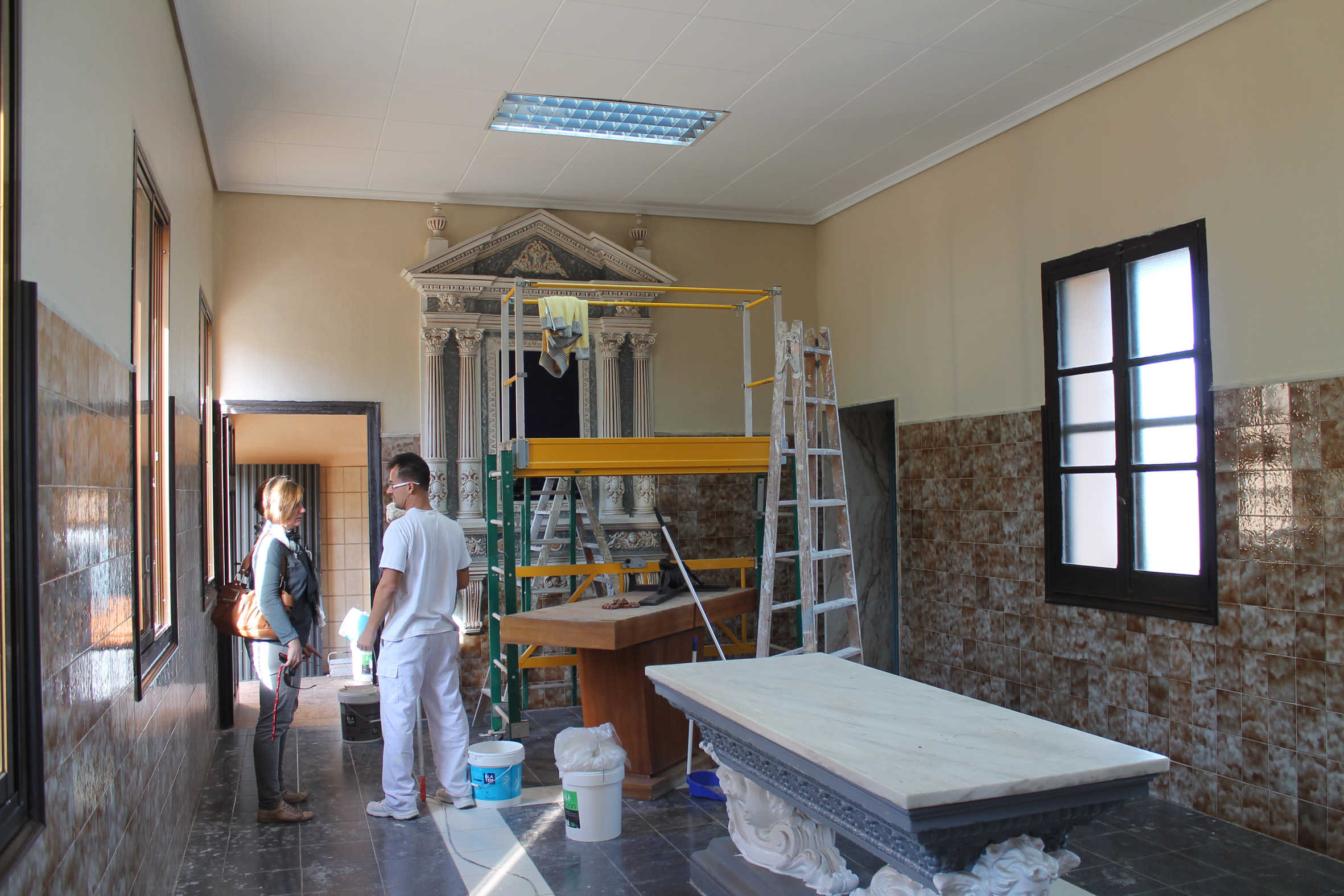 A més, s’està treballant en les zones més afectades pels desnivells de les lloses del sòl, especialment en la zona d’accés als serveis i la pròxima a la creu. “Amb el pas del temps, les lloses s’han anat desnivellant i poden provocar caigudes i accidents. Per este motiu, estem arrancant-les, ja que estaven molt deteriorades, i substituint-les per altres noves. També es va a reparar la rampa que està davant dels nínxols propietat de l’Ajuntament”, ha assenyalat Moncho, qui també ha informat que s’estan ultimant els treballs de reparació en la fase de nínxols que es va veure afectada per les filtracions i la caiguda de la cornisa, fa ara un any. Com en altres ocasions, es va a condicionar també amb plantes ornamentals el jardí on es troba ubicada la imatge de la Mare de Déu de Sales, i on se celebra la missa, perquè lluïsca el dia 1 de novembre.