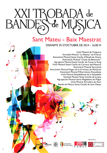 Aquest dissabte 25 d’octubre tindrà lloc a Sant Mateu la XXI Trobada Comarcal de Bandes. Un total de 14 agrupacions, amb la Banda de Música Santa Cecília de Sant Mateu com amfitriona, ompliran de melodies els carrers de la capital històrica del Maestrat.