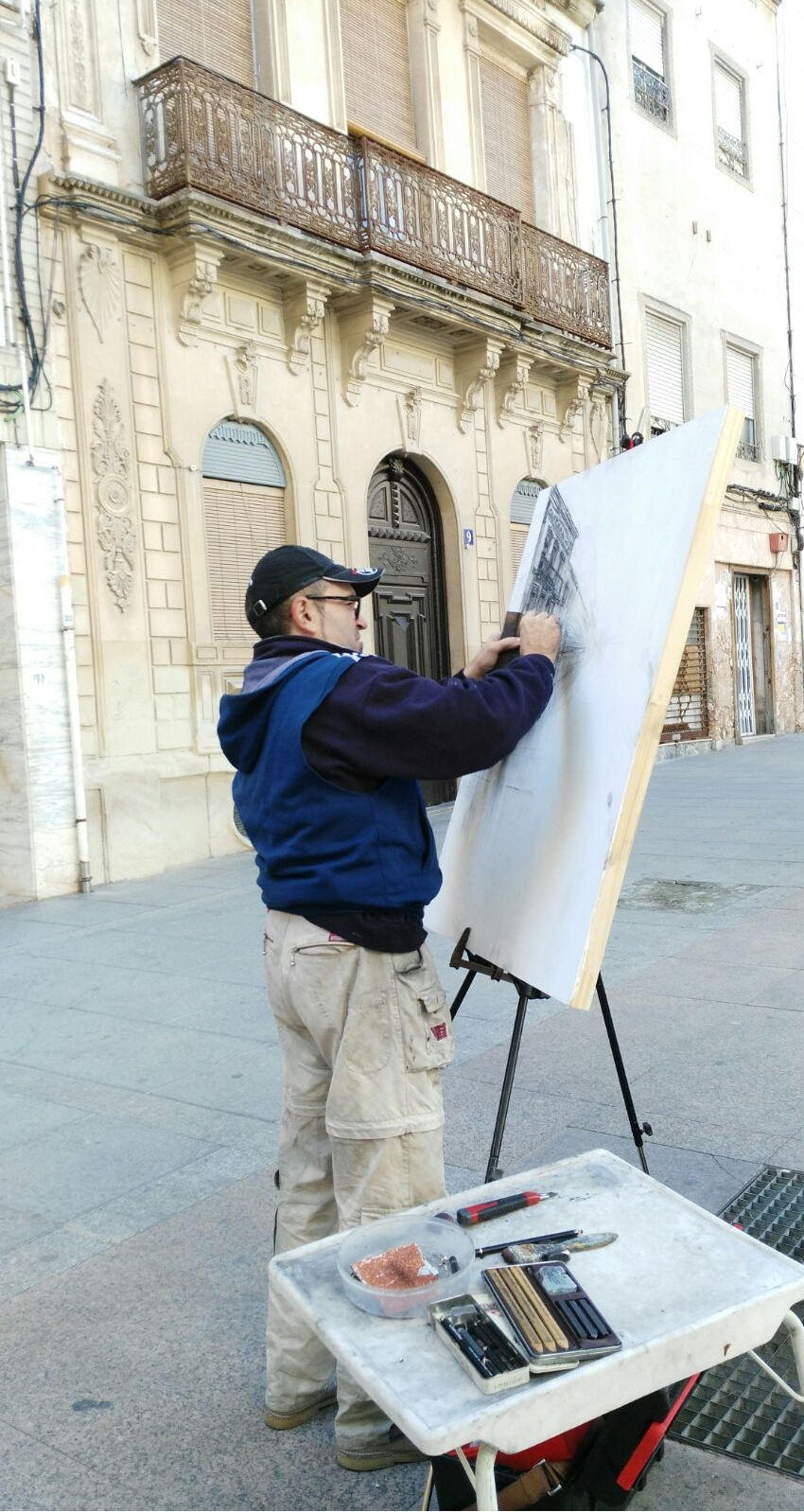 “Vull preparar una mostra del paisatge actual de Crevillent, amb edificis emblemàtics o que em criden l’atenció, com la pensió Isabel, i treballar-ho tot al natural. Este és el primer quadre que faig i la meua intenció és combinar-ho amb paisatge desaparegut, com en el cas del teatre Chapí o el cinema Iris. Per a açò utilitzaré tècniques en acrílic i carbó”, ha declarat Gomis.