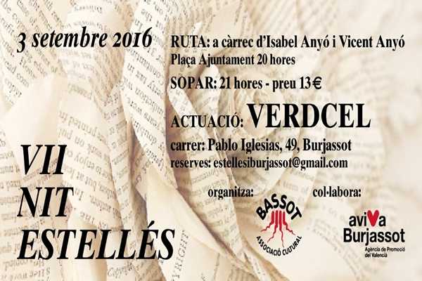 Ho farà amb la celebració de la VII Nit Estellés, una combinació de poesia, passeig, gastronomia i música, organitzada per l’Associació Cultural Bassot de Burjassot, amb la col·laboració d’AVIVA, l’Agència de Promoció del Valencià de Burjassot, que dirigeix Maria Viu.