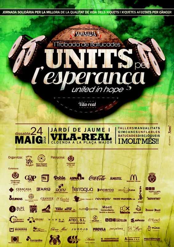 Més d’onze grups de batucada es donaran cita aquest dissabte a Vila-real per celebrar la I Trobada Solidària de Batucades que té com a finalitat donar a conèixer i recaptar fons per al projecte ‘Units per l’Esperança’. Una iniciativa de la Penya Cèltic Submarí en col•laboració amb Aspanion (Associació de Pares de Xiquets Oncològics) i el Villarreal C.F que compta amb el suport de l’Ajuntament de Vila-real destinada a millorar la qualitat de vida dels xiquets malalts de càncer.