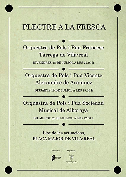 La programació continuarà el dissabte a la tarda, a partir de les 19.30 hores, amb l’Orquestra de Pols i Pua Vicente Aleixandre de Aranjuez i, a l’endemà, actuarà l’Orquestra de Pols i Pua Societat Musical d’Alboraia, encarregada de posar el punt i final al primer Plectre a la Fresca de Vila-real.