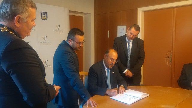 L’alcalde de Michalovce, Viliam Zahorcák, juntament amb representants de la corporació municipal eslovaca, han rebut aquest matí a l’alcalde de Vila-real, José Benlloch, i el regidor de Turisme, Emilio M. Obiol, en la recepció oficial a les delegacions de ciutats agermanades que Michalvoce ha celebrat amb motiu de la Fira de Zemplín, que se celebra aquest cap de setmana i on la delegació vila-realenca ha acudit convidada per l’Ajuntament eslovac. En el marc d’aquesta trobada, Benlloch i Zahorcák han pogut avaluar el bon estat de les relacions de germanor entre ambdues poblacions i han acordat promoure accions de caràcter cultural que puguen enfortir la cooperació mútua i generar oportunitats en ambdues ciutats.