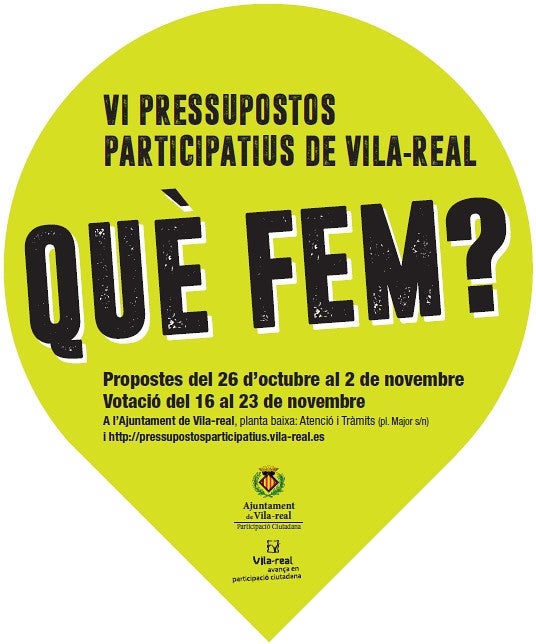 Els interessats a traslladar al consistori qualsevol idea o projecte que consideren que pot servir per a ajudar a millorar la ciutat poden acudir a l’àrea d’Atenció i Tràmits de l’ajuntament (planta baixa), on hauran d’emplenar un formulari, o, sense moure’s de casa, entrar a la pàgina http://pressupostosparticipatius.vila-real.es, on podran realitzar la seua proposta de manera virtual en pocs minuts.