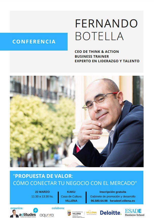 “Proposta de valor: com connectar el teu negoci amb el mercat” és una interessant ponència per a l’empresariat i persones amb negocis i es desenvoluparà en el Saló d’Actes de la Casa de Cultura el dimecres 22 de març a partir de les 11.30 hores. “Botella abordarà la importància de conèixer el nostre entorn per a prendre la iniciativa davant els canvis en la societat”, ha subratllat l’edil.