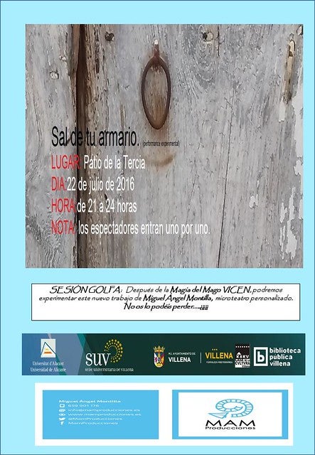 Informem que l’actuació de Miguel Angel Montilla (en la programació dels cursos d’estiu de la SEU Universitària) i la seua obra de microteatre experimental “SAL DEL TEU ARMARI”, no és aquest divendres 15.