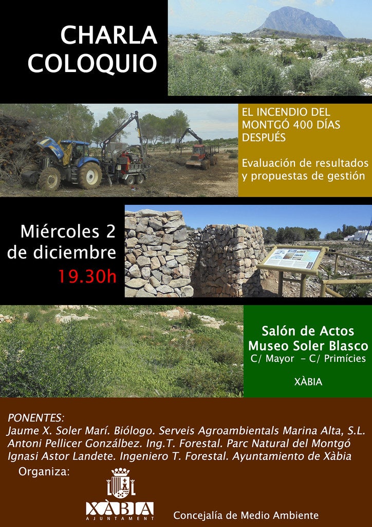 Per a parlar d’açò amb els veïns de la zona i amb persones interessades en el medi ambient ha convocat una xarrada informativa en la qual de la mà de biòlegs i enginyers forestals s’avaluaran els resultats de les accions de recuperació i es plantejaran propostes per a la futura gestió. La conferència “400 dies després de l’incendi en el Montgó” serà el dimecres 2 de desembre, a les 19’30 hores en la sala d’actes del Museu Soler Blasco.