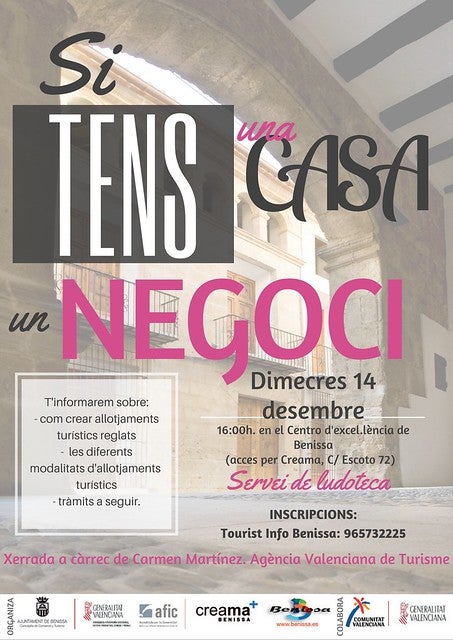 Per a açò, s’ha organitzat una xarrada informativa en el Centre d’Excel·lència de Benissa el dimecres 14 de desembre a les 16:00 en la qual es comptarà amb la presència de la cap del Servei d’Ordenació de l’Agència Valenciana del Turisme, Sra. Carmen Martínez Aznar, qui exposarà les diferents modalitats d’allotjaments turístics, la importància de la legalitat dels mateixos, així com els passos a seguir per a tramitar la seua obertura.