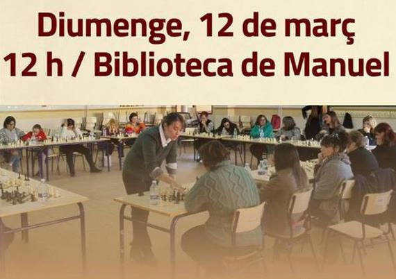 A càrrec d’Angels Cucarella, psicòloga i campiona d’escacs. Organitzat amb la col·laboració del Club d’Escacs “Eduardo Pérez” Diumenge 12 de març A les 12h A la biblioteca de Manuel