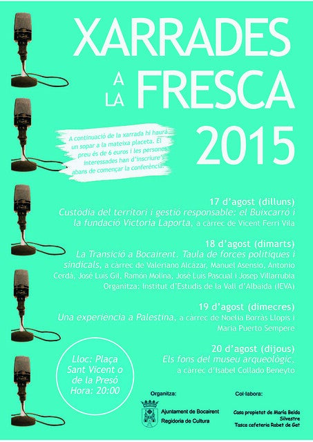 El biòleg Vicent Ferri serà l’encarregat d’obrir l’edició del 2015 amb “Custòdia del territori i gestió responsable: el Buixcarró i la fundació Victoria Laporta” que analitzarà el cas d’aquesta finca que ocupa més de 600 hectàrees de terreny a la serra de Mariola amb presentació prèvia a càrrec de Júlia Molina, tècnica del mateix parc natural. Per a l’endemà, l’Institut d’estudis de la Vall d’Albaida ha preparat una taula redona sobre la transició a Bocairent amb la participació de representants de les diferents forces polítiques i sindicals del moment com Valeriano Alcázar, Manuel Asensio, Antonio Cerdá, José Luis Gil, Ramón Molina, José Luis Pascual i Josep Villarrúbia. El president de l’IEVA, Josep Calatayud, introduirà aquesta nova proposta de l’entitat mentre que Rubén Molina moderarà el debat.