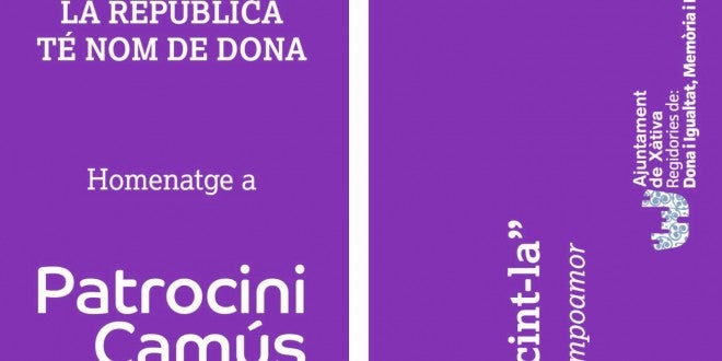 Les regidories de Dona i Igualtat, Educació i Memòria Històrica de l’Ajuntament de Xàtiva han preparat un acte reivindicatiu del paper de les dones en la II República, en el marc de les celebracions al voltant del 14 d’abril. De resultes, el proper dijous 14 d’abril, a les 20:30 a la plaça Sant Jaume, tindrà lloc l’acte “La República té nom de dona”, que s’aprofitarà per homenatjar a Patrocini Camús (1907-2008), portadora de la bandera republicana pels carrers de Xàtiva el dia en què es va proclamar la II República. L’acte comptarà amb l’actuació de l’Escola de Danses de Xàtiva.