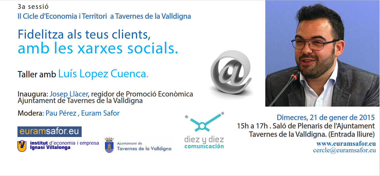 La xerrada amb el titol genèric “Fidelitza els teus clients amb lex xarxes socials” tindrà lloc en el Saló de Plenaris de l’Ajuntament, amb entrada lliure i a desenvolupar entre les 3 i les 5 de la vesprada a càrrec de Luís López Cuenca, comunicador, formador i investigador en els meitjans socials. La presentació serà a càrrec del regidor, Josep LLácer i la moderació serà de Pau Pérez, d’Euram de la Safor.