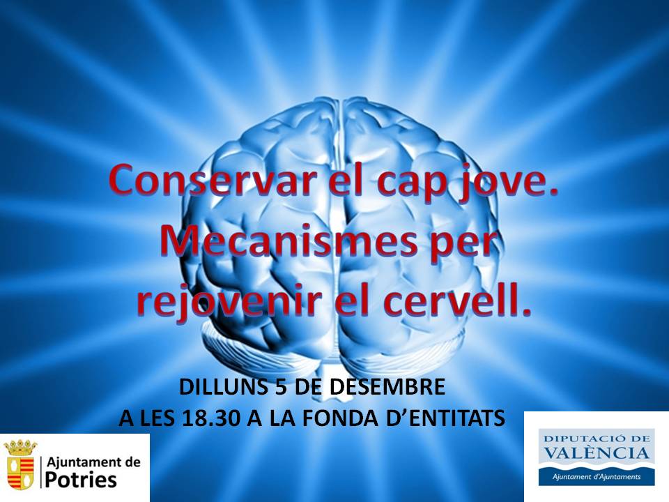 Hui, dilluns 5 de desembre, a les 6.30 de la vesprada, a la Fonda d’Entitats (Llar Juvenil) tindrà lloc la xerrada “Mantenir el Cap Jove: mecanismes per rejovenir el cervell” , per a totes i tots aquells que hi vulguen assistir.