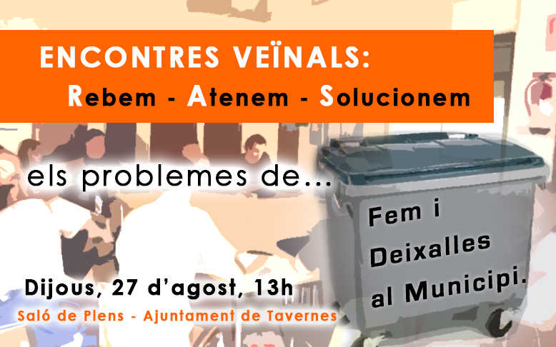 La primera d’aquestes reunions es farà el 27 d’agost a les a les 13:00 hores al Saló de Plens, i s’intentarà solucionar les incidències que hi haja en matèria de “Fems i deixalles”. Estarà oberta per qualsevol veí de Tavernes que tinga interés en el tema.