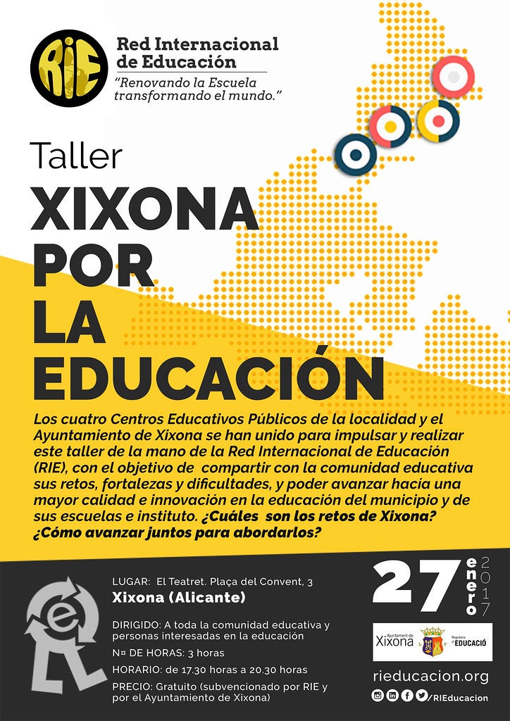 Així mateix, en el taller, que comptarà amb una part teòrica i una altra pràctica, s’explicarà en què consisteixen els projectes que realitza la RIE en pobles i ciutats de tot el món i que estan aconseguint convertir a les escoles i a la comunitat educativa en protagonistes i motor de la societat.
