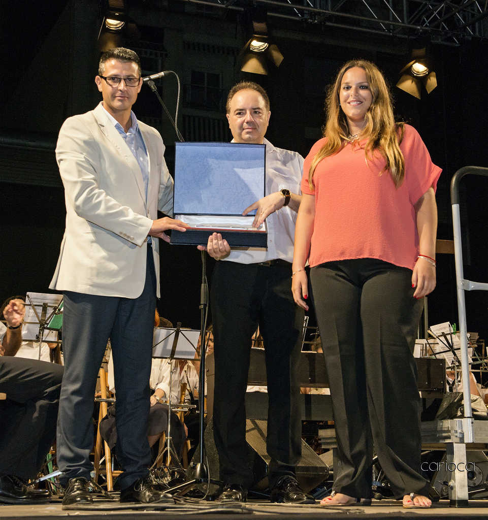 Conclós d’aquest apoteòsic final amb segell valencià, va arribar el lliurament de la distinció commemorativa. La Reina de les Festes 2015, Érica Vendrell, i l’alcalde, Toni González, foren els encarregats de pujar a l’escenari per a agrair a l’agrupació la seua presència i l’esforç mostrat durant tot l’any en la promoció de la música en la localitat. El mestre director Josep Escandell, va arreplegar el guardó en nom de la Societat Musical Lira Almussafense.