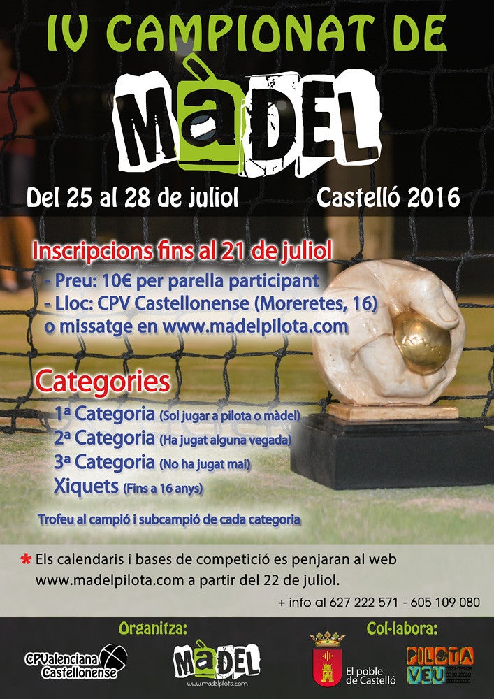 Després de l’èxit de participació i de nivell de joc de la passada edició, el Club de Pilota Valenciana Castellonense juntament amb madelpilota.com, tornen a organitzar una nova edició d’aquest campionat, concretament la IV, que es disputarà del 25 al 28 de juliol a la pista de pàdel del poliesportiu municipal de Castelló de la Ribera.