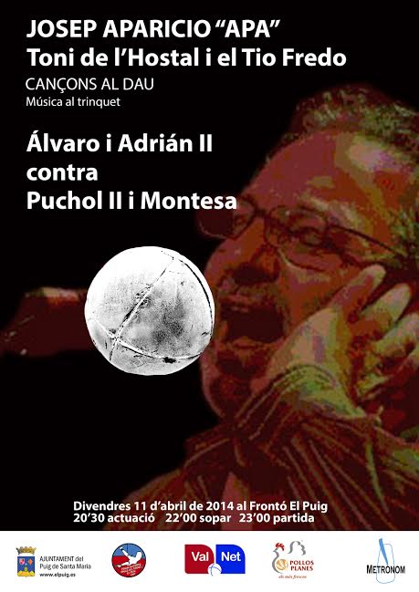 L’activitat al Puig començarà a les 20.30 hores, amb les actuacions musicals. Després, cap a les 22.00 hores, serà el temps perquè els espectadors sopen per a, a les 23.00 hores, donar pas a la partida, un interessant duel de parelles en què els dos màxims exponents de la modalitat de les tres parets, Álvaro i Adrián II, amics i companys d’entrenaments, tindran en la contra un jove valor com Puchol II i l’ídol local Montesa.