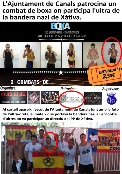L’Ajuntament de Canals patrocina un combat de boxa on participa l’ultra de la bandera Nazi de Xàtiva, segons denúncia en twitter Anifeixistes del País Valencià.