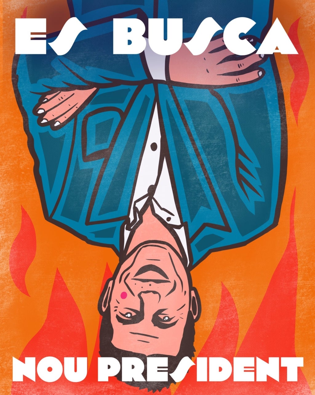 El cartell permet llegir la frase «Fora del País Valencià» a la part baixa, tot i que l’artista n’ha fet altres versions es les quals es pot llegir «es busca nou president», «la llengua no es toca» o «la llengua de ma “uela” no es toca».