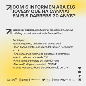 Com s’informen els joves? Per què estan tant de temps amb els mòbils? Què veuen? Què busquen? Cap on condueix tot açò la nostra societat? Aquestes preguntes són les que va intentar respondre les jornades celebrades al Centre Octubre Cultura Contemporània, a València (l’Horta), que va transformar-se en l’epicentre d’una revolució comunicativa durant aquesta setmana. Acicom (Associació Ciutadania i Comunicació) va coordinar aquesta proposta que intenta endinsar-se en les intricades fonts de la informació juvenil en l’era digital. El tema «Nous Perfils Informatius, Xarxes Socials i Fake News» va obrir el debat sobre com els joves s’informen, es connecten i participen en la societat actual.