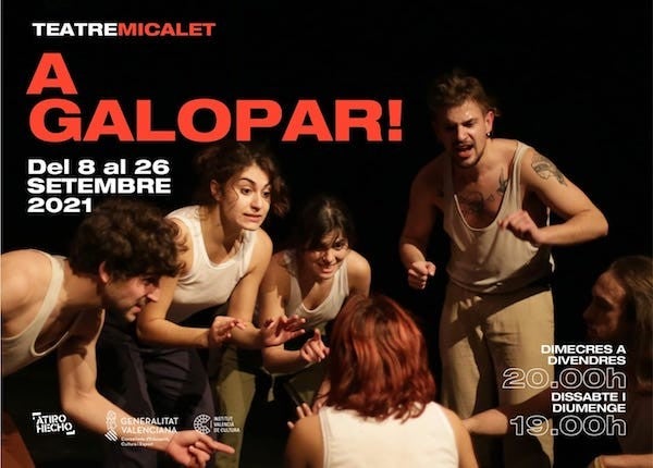 El Teatre Micalet presenta a partir d’aquest dimecres i fins al 26 de setembre A galopar!, de la companyia Atiro Hecho, un espectacle que estableix un paral·lelisme entre el moviment dels indignats del 15M i el clima revolucionari anarco-sindicalista durant la Segona República. És una revisió del segon muntatge de la companyia, Ladran, luego cabalgamos, estrenada el 2013 i representada per tot l’estat espanyol i part de Sud-amèrica, feta per un grup de joves que donen la seua visió de la història i de l’avenir. Una nova versió que «incorpora referències a la Primavera valenciana – entre altres- i reflexiona sobre la necessitat de no perdre la convicció revolucionaria a mesura que ens fem grans».
