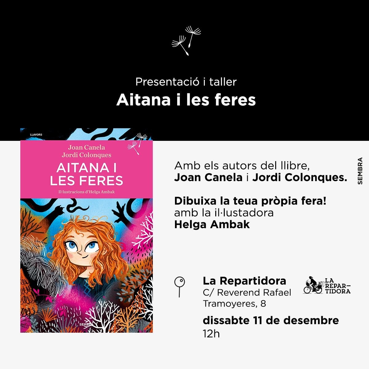 El premiat tàndem Joan Canela i Jordi Colonques presenta Aitana i les feres (Sembra), la divertida i emocionant aventura d’una xiqueta decidida a posar fi a les injustícies del seu món. El llibre, que ja ha arribat a la segona edició es presentarà aquest dissabte 11 de desembre, a les 11 del matí, a la llibreria La Repartidora, de Benimaclet, a València. L’acte comptarà amb un taller d’il·lustració de feres impartit per Helga Ambak, autora de les il·lustracions del llibre.