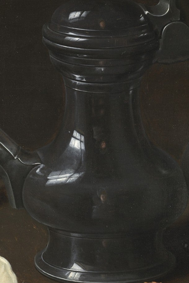 Tornem a contemplar el seu rostre diminut en les superfícies lluentes de copes i gerres, en què es reflecteix mentre pinta. Un rostre que, sovint, apareix repetit unes quantes vegades en les diferents cares i plans d’aquests atifells, com si demanara que la tinguérem present. Atrapada en aquests reflexos, que evidencien un control absolut de la llum i de la incidència de la mateixa en cada atuell, i també de l’òptica, de la perspectiva i de l’escala, Clara Peeters sembla que ens interpel·le per tal de saber quins són les raons que han fet que, darrere de la seua figura, hi haja un buit enorme.