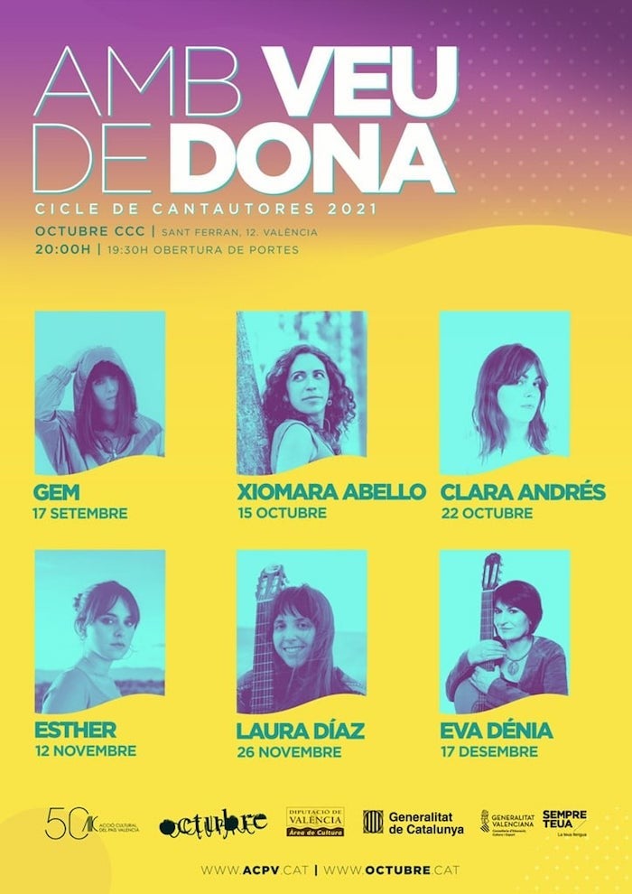 L’Octubre Centre de Cultura Contemporània de València engega la nova temporada d’activitats amb una ferma aposta pel panorama musical valencià. El cicle Amb veu de dona s’inicia aquest divendres, 17 de setembre, amb Gem i clourà el 17 de desembre amb el comiat de la icònica veu d’Eva Dénia, que tancarà així la seua carrera musical com a cantautora.