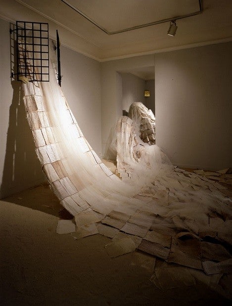 En “Cartes teixides”, un article publicat a la revista Arte y parte el 1998, Elena del Rivero (València, 1952), artista instal·lada a Nova York des de principis de la dècada del 1990, diu a propòsit de la seua obra: “Faig ús fonamentalment de la costura i, en general, del teixir, per recordar les tasques del brodat i de la cura de la casa […] Durant mil·lennis, les dones han dedicat les seues vides a filar i a teixir mentre cuidaven els fills i feien els treballs domèstics. Fil, tela, seda… materials efímers que volen ser metàfora de la vida i de les feines de les dones que els han confeccionat i emprat en el passat”. No debades ha dut a terme moltes de les seues peces amb aquests elements; només cal veure La perfecta casada (2001), una instal·lació amb què rebat el llibre homònim de fray Luís de León, un tractat sobre l’educació de les dones i el matrimoni paradigmàtic i de gran transcendència.