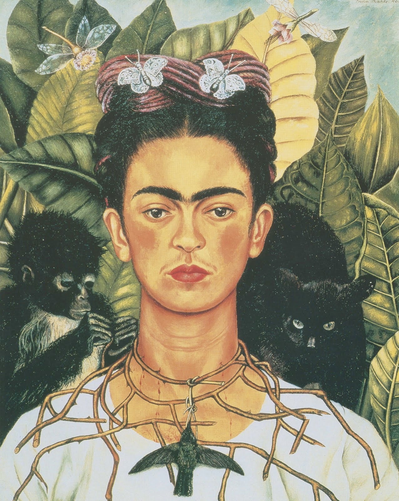 Tot és exuberant en les pintures de Frida Kahlo, una dona que no concebia fer res a mitges, ni en l’art ni en la vida. En la majoria dels nombrosos autoretrats que va dur a terme, la natura es desborda, els animals comparteixen l’espai, els vestits –sobretot, els tradicionals- resplendeixen com joies, els elements simbòlics i onírics prenen protagonisme en qualsevol detall, el cos, tan maltractat, s’hi mostra sense concessions, d’una manera crua –també les entranyes si cal-, i la cabellera fosca, ornada amb els més diversos complements, s’erigeix com un emblema de la seua personalitat. A més, la presència de pèl al rostre s’amplifica: les celles negres i espesses que s’ajunten sobre el nas i el bigot lleu hi apareixen ja, amb més o menys contundència, en els més primerencs. A Los años con Laura Díaz (1999), l’escriptor mexicà Carlos Fuentes descriu la pintora difunta quan el personatge principal de la novel·la acudeix a fotografiar-la: “La cara de Frida Kahlo no había cambiado con la muerte. […] La espesura de las cejas pretendía, pero no lograba, disimular el bigote de Frida, el bozo notorio y notable que cubría su labio superior y hacía pensar que entre sus piernas un pene gemelo del de Diego [Rivera] pugnava por brotar hasta completar en Frida la probabilidad, más que la ilusión, del ser hermafrodita, y, más aún, partenogenético, capaz de fecundarse a sí misma y generar, con su propio semen, el nuevo ser que ella misma, su parte femenina, pariría gracias al vigor de su parte masculina”.