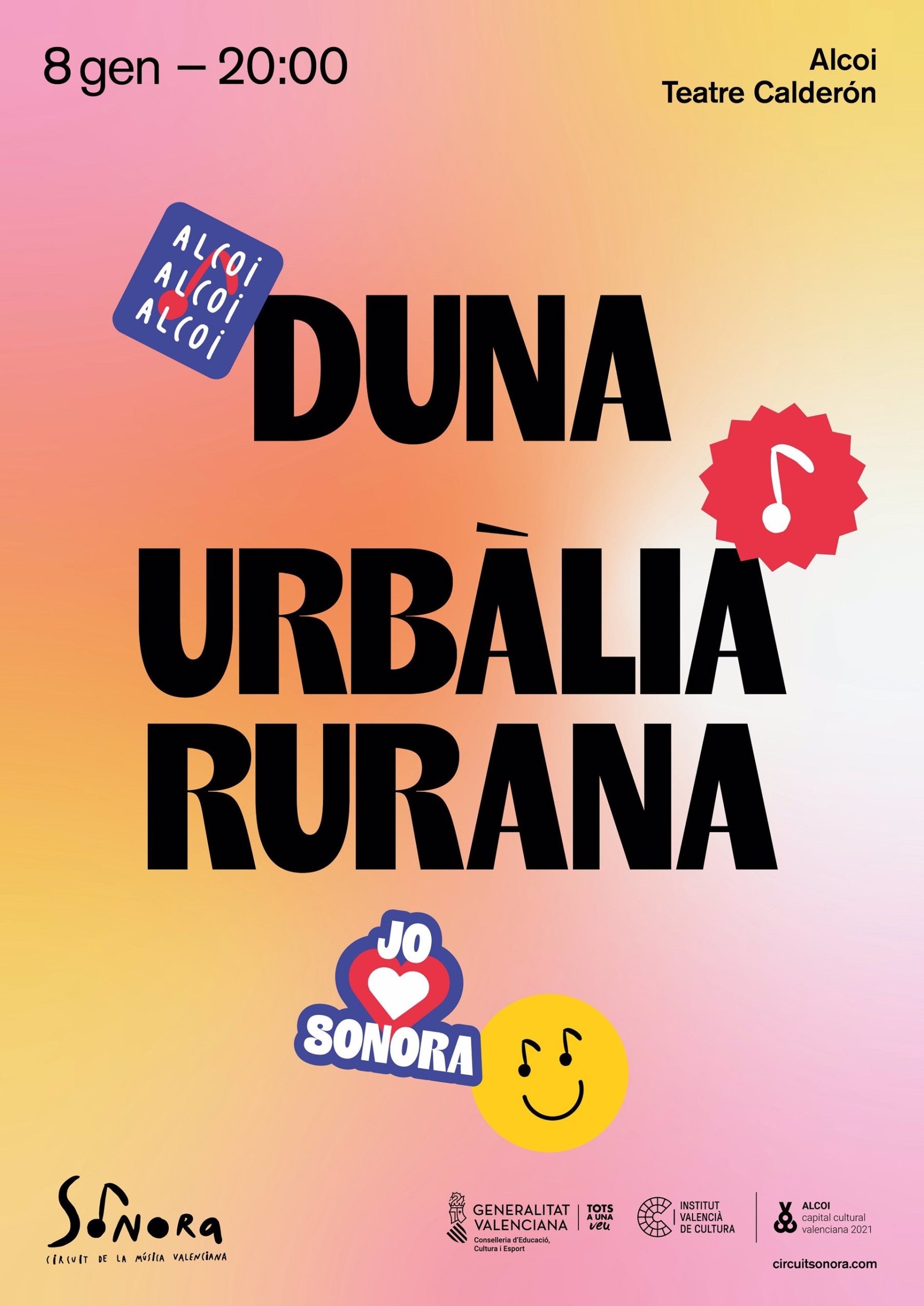 El circuit de la música valenciana Sonora, organitzat per la Conselleria de Cultura a través de l’Institut Valencià de Cultura (IVC), arriba aquesta setmana a Alcoi, on oferirà aquest dissabte a les 20.00 hores al Teatre Calderón les propostes de folk dels grups Duna i Urbàlia Rurana, dues actuacions finalistes en els Premis Carles Santos 2020.