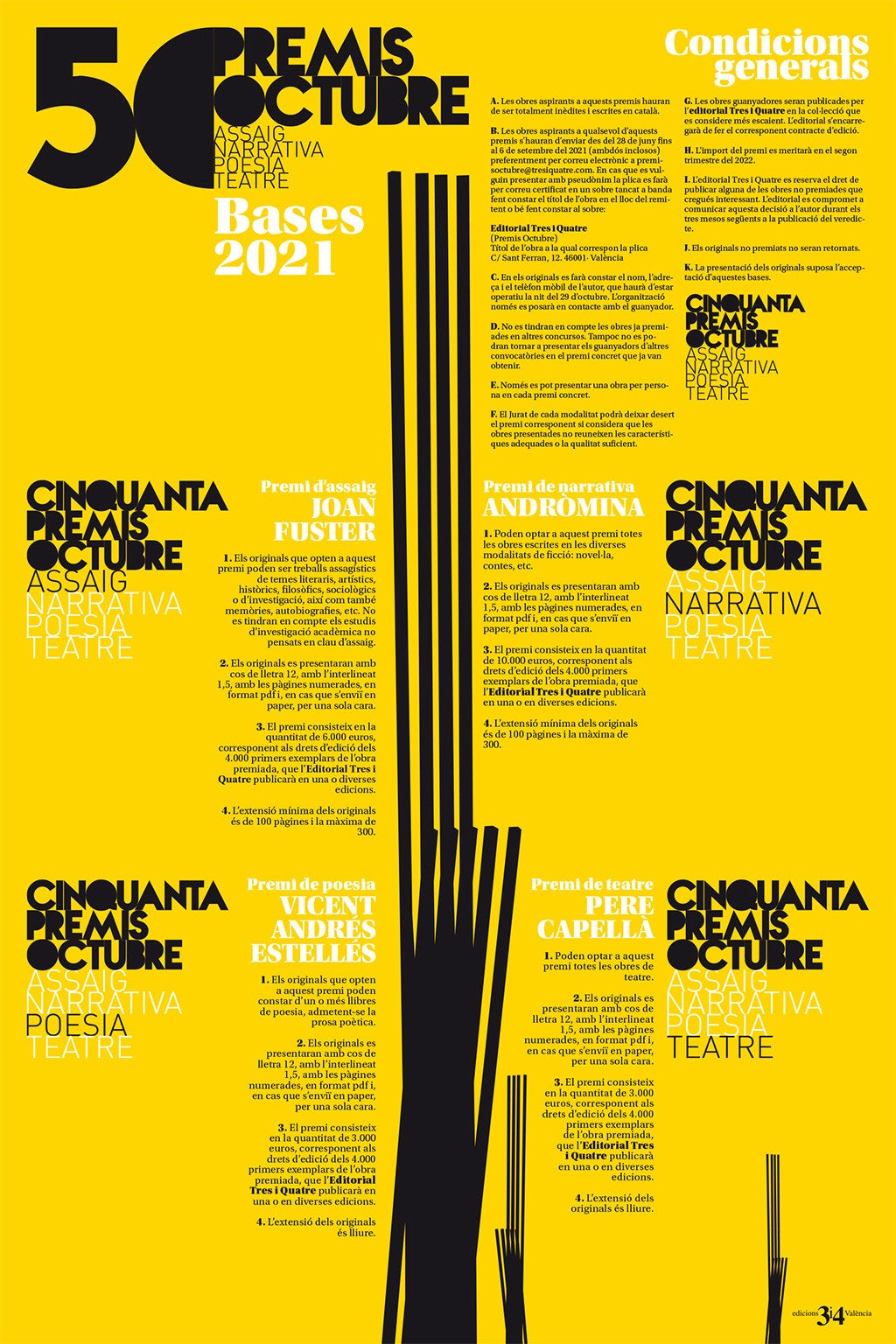Un total de 99 obres opten a guanyar el premi Andròmina de narrativa, 116 originals aspiren al premi Vicent Andrés Estellés de poesia, 27 al premi d’assaig Joan Fuster i 51 al premi Pere Capella de teatre. Les obres, com és característic en aquest certamen organitzat per l’Editorial 3i4, han estat presentades per autors dels Països Catalans.