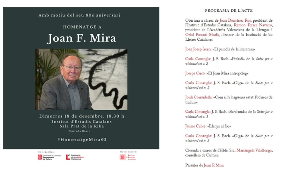 L’homenatge a Joan F. Mira, president d’ACPV, s’iniciarà a la sala Prat de la Riba de l’IEC amb una projecció audiovisual. L’obertura institucional de l’acte serà a càrrec de Joan Domènec Ros, president de l’IEC, Ramon Ferrer Navarro, president de l’Acadèmia Valenciana de la Llengua i Oriol Ponsatí-Murlà, director de la Institució de les Lletres Catalanes.
