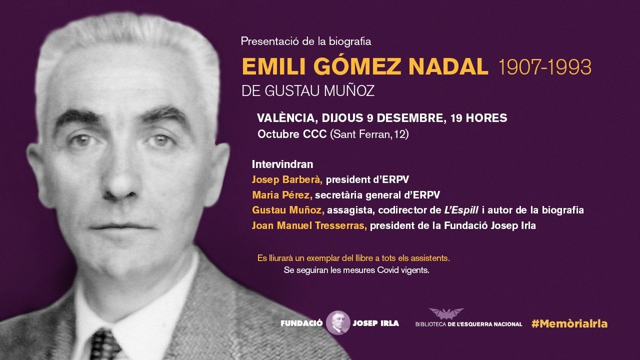 La biografia Emili Gómez Nadal (1907-1993), escrita per l’assagista i activista Gustau Muñoz, es presenta aquest dijous, a les 19 hores, a l’Octubre CCC de València. L’obra forma part de la Biblioteca de l’Esquerra Nacional de la Fundació Josep Irla, que ja compta amb volums dedicats a Gonçal Castelló (1912-2003), Vicent Marco Miranda (1880-1946) i Constantí Llombart (1848-1893), entre altres obres.