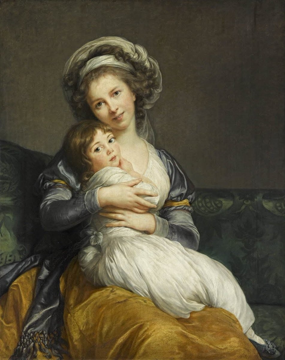 Asseguda en un sofà luxós -l’única referència de l’espai on se situa l’escena-, Élisabeth Vigée Le Brun (1755-1842) ens mira i somriu de manera càlida, franca i acollidora mentre abraça la petita Julie, la seua filla, que també ens fita. El blanc pur del vestit de xiqueta destaca amb força damunt del groc de les faldilles de seda, unes robes cares que palesen la posició social que ha assolit la pintora. Un conjunt al qual atorga una aire personal un gran turbant col·locat amb total llibertat: “El meu pentinat no em costava gens, jo mateixa m’arreglava els cabells i sovint em lligava al cap un mocador de mussolina”, assenyala a les Memòries. De fet, algunes crítiques apuntaven que l’evident satisfacció amb què l’artista exhibia la seua bellesa, com si intentara seduir l’espectador, s’allunyava del comportament propi d’una mare. Una actitud censurable, atès que autors rellevants –el mateix Rousseau, per exemple- pensaven que les dones sempre estaven provocant els homes i que en aquest aspecte la coqueteria constituïa una amenaça. Calia, doncs, allò que la natura havia previst per evitar-ho: la vergonya o el pudor.