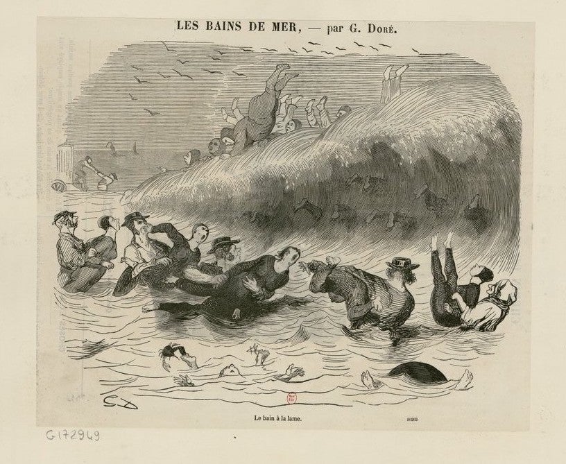 Aquests gravats de Doré, en canvi, malgrat que no tenen la causticitat dels d’Honoré Daumier, aporten una visió crítica, punyent i divertida d’aquesta afluència considerable vora mar. En un altra il·lustració en què aborda el mateix assumpte, una mica posterior, l’artista centra l’escena al rompent, just abans que l’onada trenque. Alguns agosarats cavalquen sobre la cresta, fins i tot n’hi ha un que sembla a punt de fer un volantí; uns altres, dels quals només hi veiem la planta dels peus, s’han capbussat al mur aquàtic; i, els guies subjecten unes dones, que adopten postures ben grotesques, a fi d’enfonsar-les en l’instant adequat. En primer terme, un parell de nadadors fan el mort i, en l’últim, un altre guia estira dels braços una persona poregosa que no s’acaba de decidir a baixar de la bathing machine.