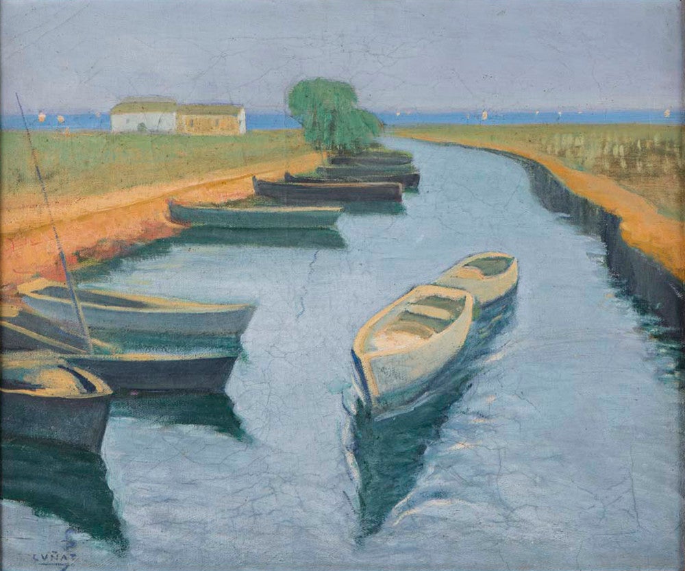 Un paratge sobre el qual trobem en la mostra una altra obra molt posterior: Canal de l’Albufera, d’Enrique Cuñat (València, 1883 – 1959), un pintor qualificat de paisatgista peculiar per la voluntat d’allunyar-se de l’òrbita de Joaquín Sorolla. I que ho va fer, apunta David Gimilio, curador de Més Museu, “enfrontant-se al paisatge des d’una perspectiva nova, amb alguns enquadraments arriscats, distanciant-se de la llum exuberant i mediterrània, atenuada amb el color”. Un color que “Cuñat usa amb discreció, amb subtilitat”. El 1925, el periodista Artur Perucho (Borriana, 1902 – Mèxic DF, 1956), amb motiu d’una exposició de Cuñat al vestíbul del Teatre Principal de la seua ciutat, escrivia a El Pueblo: “Domina –¡todavía!– la tendencia sorollista en nuestros jóvenes pintores; tendencia que, por la fama de su magnífico iniciador, da muchas facilidades de éxito a los que la siguen. Pues bien; Enrique Cuñat va contra la corriente, no es sorollista, acaso no quiere serlo. Ha heredado de Sorolla lo legítimo: la rebeldía, no la visión ni la técnica. Por eso sus cuadros saben a cosa nueva, selecta, pura y nos producen una sensación que ninguna otra pintura nos supo dar”. I, el 1928, al catàleg de l’exhibició conjunta de Vicent Mulet i Enrique Cuñat a les Galeries Laietanes de Barcelona, hi deia: “Tots dos es caracteritzen pel seu afany de defugir les llums violentes i enlluernadores, grates a l’escola de Sorolla. I així, naturalment, els ha fet esdevenir pintors d’una més fina sensibilitat, per tal com els obliga a matisar d’una manera més suau i delicada que no els que pinten paisatges a ple sol –aquell sol de l’horta valenciana que esborra els contorns i no deixa veure els detalls de les coses” (citat per Josep M. Palomero en Estudi biogràfic i literari d’Artur Perucho, 2015). El 1931, Cuñat va començar a participar en les exposicions de la Sala Blava, un espai creat el 1929 al carrer Redempció, a prop de la Universitat, amb la intenció de promocionar els moviments artístics que rebutjaven l’academicisme. Un espai que aplegava el nucli renovador valencià i on es duien a terme conferències i reunions a les quals assistien, entre altres, Josep Renau, Manuela Ballester, Tonico Ballester, Rafael Pérez Contel, Maria Labrandero, Max Aub, Juan Gil-Albert i Francesc Almela i Vives. En aquest mateix centre, s’hi va fundar llavors l’Agrupació Valencianista Republicana. Cuñat, afiliat a la CNT, durant la Guerra Civil, va col·laborar en els treballs dels tallers gràfics de l’Aliança d’Intel·lectuals Antifeixistes i va dissenyar nombrosos cartells per a la CNT-FAI.