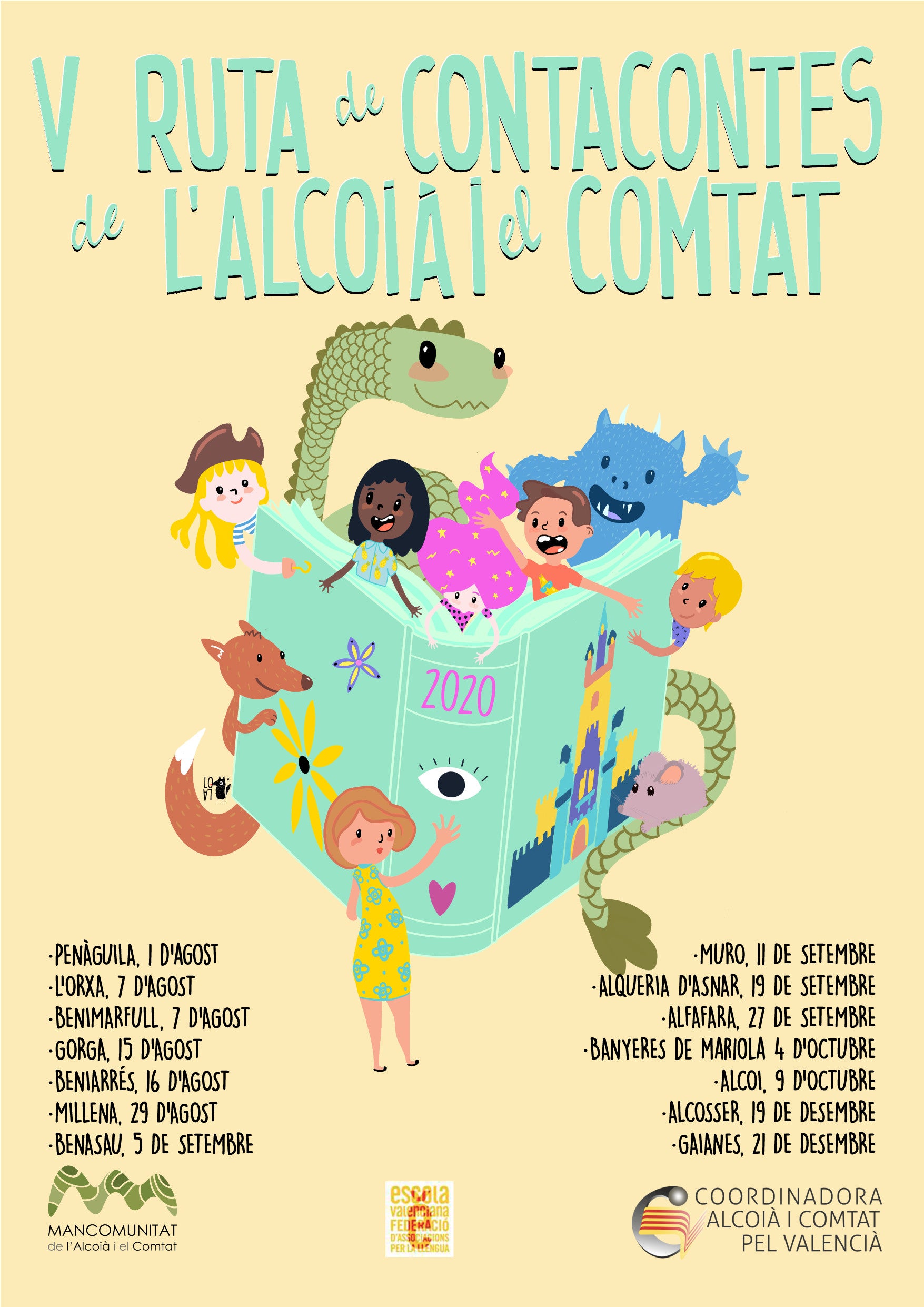 La Mancomunitat de Municipis de l’Alcoià i el Comtat, en col·laboració amb la Coordinadora pel Valencià, organitza la V edició de la Ruta de Contacontes 2020 durant els mesos d’agost i tardor. Una iniciativa necessària, en uns moments en què s’estan suspenent molts actes culturals. La ruta consisteix en un espectacle de narració oral en cadascun dels dèsset pobles que integren la Mancomunitat. Els espectacles es faran respectant la normativa actual i prenent les mesures de precaució necessàries, de manera que siga una oportunitat per gaudir de contes i llegendes en família. Durant l’agost, està confirmada la participació d’Almudena Francés, Eva Andújar, Lluís Abad, Jordi Carbonell, Carles Llinares i Sílvia Colomer. L’horari i els detalls de cada ruta s’anunciaran per les xarxes socials i a la pàgina www.alcoiacomtatpelvalencia.org.