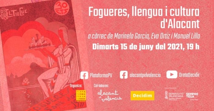 Enguany tampoc hi haurà Fogueres de Sant Joan a Alacant, però la Plataforma per la Llengua ha organitzat un acte audiovisual sota el títol «Fogueres, llengua i cultura a Alacant». L’acte s’emetrà aquest dimarts, 15 de juny, a les 19 h, en directe, de forma telemàtica, conjuntament pel canal de Youtube de la plataforma Decidim, i pel Facebook de la Plataforma per la Llengua i el d’Alacant pel valencià.