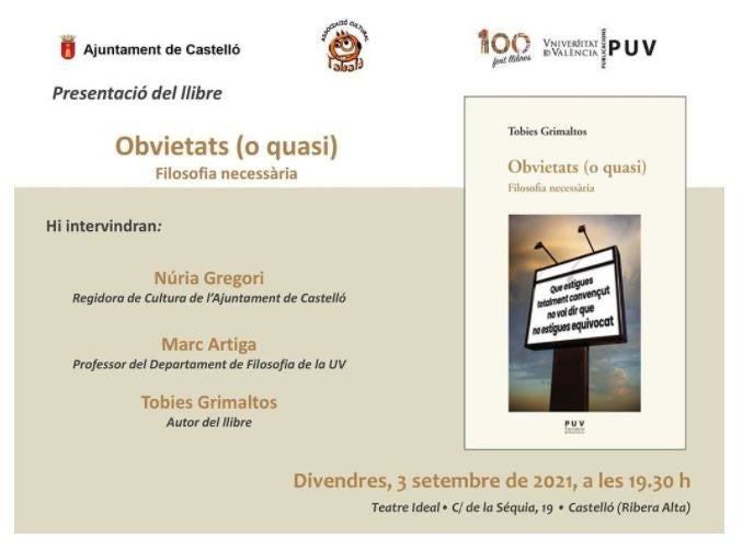 Tobies Grimaltos presenta Obvietats (o quasi). Filosofia necessària (Publicacions de la Universitat de València) al Teatre Ideal de Castelló (la Ribera Alta) aquest divendres, 3 de setembre, a les 19.30 h.