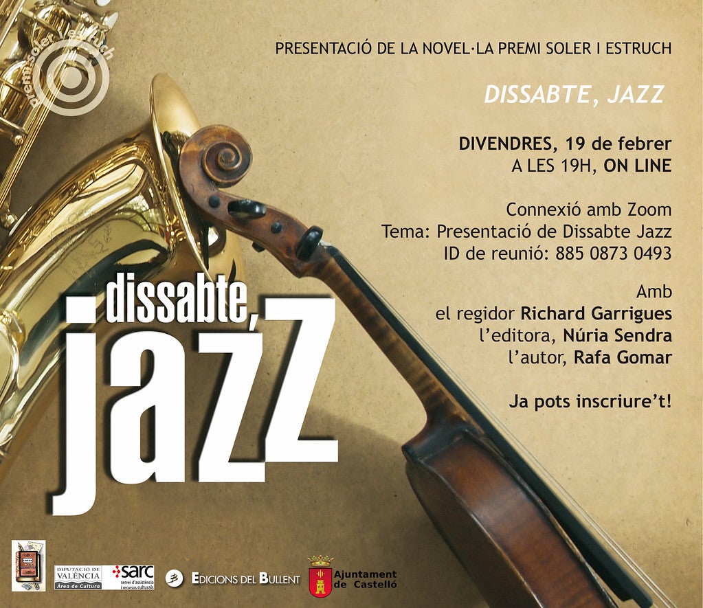 Demà, divendres 19 de febrer, es presenta la novel·la Dissabte, jazz de Rafa Gomar, guanyadora del Certament Castellum Ripae 2019 i guardonada amb el Premi Soler i Estruch de Castelló (la Ribera Alta). L’acte es celebrarà en línia, a través de la plataforma Zoom, a partir de les 19h i comptarà amb la participació del regidor Richard Garrigues, l’editora del llibre Núria Sendra i l’autor del llibre.