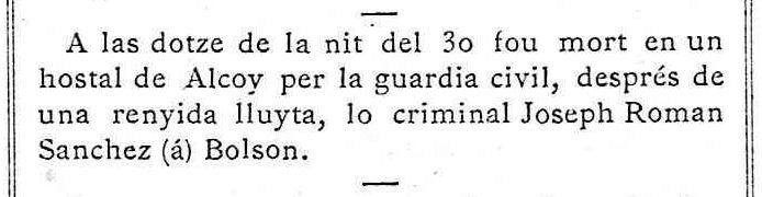 Després d’acabar amb la vida del Cabo, Bolsón tornava a desaparéixer per una llarga temporada. El bandoler de Manuel degué veure’s obligat a canviar d’aires, potser perquè a la zona de Xàtiva i rodalia corria perill, o potser perquè la seua situació sentimental havia fet un gir radical. De fet, el seu nom va caure en l’oblit, almenys per a la premsa d’ací i d’allà, i no va ser mencionat fins a la matinada anterior a la vespra de Tots Sants de 1879, quan era sorprés per un escamot de guàrdies civils a la posada de la Verge Maria d’Alcoi. Allà es desencadenava un tiroteig entre ell i els efectius de la força armada, sobre les dotze i quart de la nit del 30 d’octubre, arran del qual queia abatut Bolsón. El rotatiu alcoià El Serpis (1-11-1879), en una clara mostra d’exaltar la notícia, destacava que el nombre d’assassinats consumats pel manuelí oscil·lava entre setze i divuit —posteriorment, el pujava a vint-i-dos—, entre els quals figurava el d’una cunyada seua. I, tot seguit, afegia: