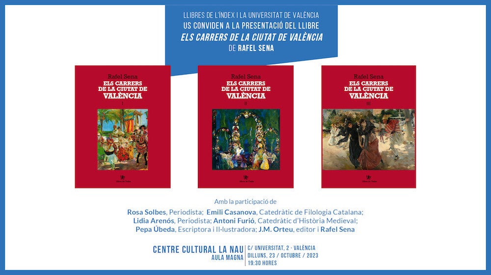 L’Escola Europea de Pensament Joan Lluís Vives del Vicerectorat de Cultura i Societat de la Universitat de València ha organitzat un debat per a presentar els tres volums d’«Els carrers de la ciutat de València», de Rafael Sena, publicats per Llibres de l’Índex, que tindrà lloc a l’Aula Magna del Centre Cultural La Nau dilluns 23 d’octubre, a les 19.30 h.