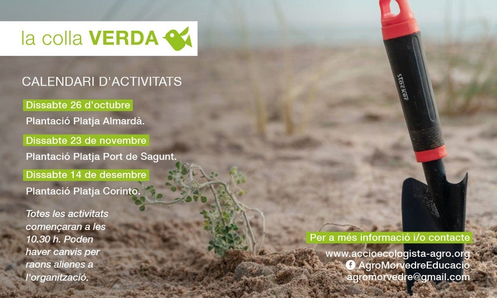 Amb este objectiu el projecte de voluntariat ambiental de l’Ajuntament de Sagunt i Acció Ecologista-Agró ha convocat tres plantacions a la vora de la mar amb la col·laboració del Centre per a la Investigació i Experimentació Forestal (CIEF) de la Generalitat Valenciana. La segona plantació serà el pròxim dissabte 23 de novembre, a les 10:30 hores, a la platja del Pantalà del Port de Sagunt.