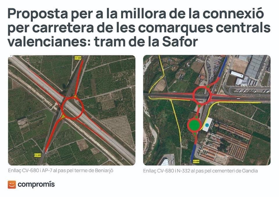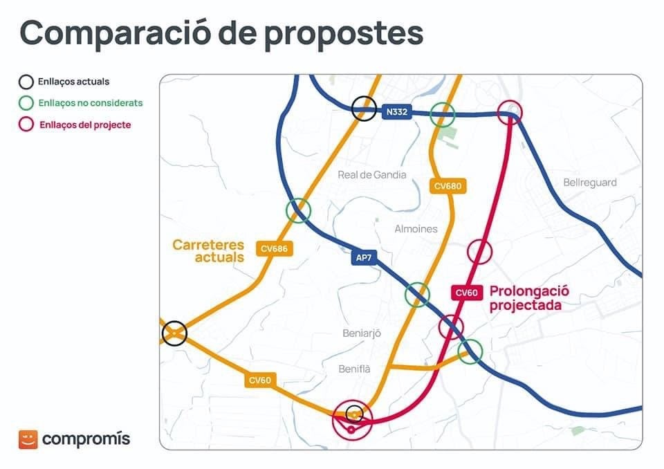 Compromís ha presentat aquest dimarts davant de l’Ajuntament de Gandia una sèrie d’al·legacions al projecte de prolongació de l’autovia CV-60 a la Safor i una solució alternativa basada en la millora de la mobilitat comarcal mitjançant una adequada connexió ferroviària que contribuïsca a reduir el trànsit pels municipis que travessa l’N-332 i en la creació de dos enllaços, a partir d’una infraestructura viària existent com és la CV-680, per accedir a l’AP-7 i l’N-332 al trànsit provinent de la Vall d’Albaida.