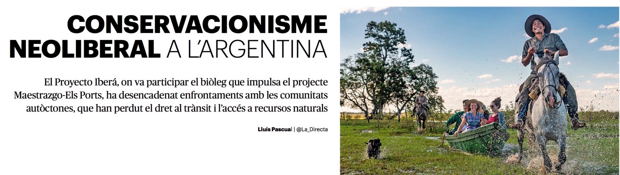 El segon reportatge, “Conservacionisme neoliberal a l’Argentina”, signat per Lluís Pascual, s’analitza el projecte en què participà Ignacio Jiménez abans de 2019, que el promotor utilitza d’aval professional en totes les presentacions i entrevistes. El periodista viatja fins a l’Argentina per descriure de primera mà el tracte que el projecte donà als habitants d’aquelles terres i quin fou el veritable paper que jugà Ignacio Jiménez en les pressions a la comunitat perquè abandonara el territori. En aquest reportatge es recull el testimoni de quatre habitants de les terres afectades pel Proyecto Iberá, alguna de les quals va treballar per a l’empresa: Cristian Piriz i Emilio Spataro, membres de l’organització Guardianes del Iberá; Miriam kuña pya guasu Sotelo, militant de la Federació Camperola Guaraní de Corrientes i representant provincial al Consell de Participació Indígena, i Carina Jofré, investigadora del CONICET i activista del poble huarpe. En aquest text s’adverteixen els paral·lelismes entre el projecte que Ignacio Jiménez desenvolupà a l’Argentina i l’actual, com ara la possibilitat d’una administració sense projecte que compra la idea al promotor sense cap document escrit i sense cap estudi de viabilitat perquè l’empresa puga fer i desfer sense control.