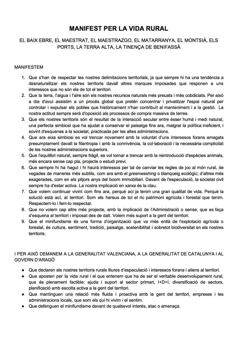El Manifest per la Vida Rural s’ha fet públic avui 10 de juny de 2020 a través de les xarxes socials de la Plataforma No al Yellowstone Europeo. El document exalça la història, els recursos naturals i el treball de la gent que viu a les comarques del Baix Ebre, el Maestrat, el Maestrazgo, el Matarranya, el Montsià, els Ports, la Terra Alta i la Tinença de Benifassà, i incideix en la complicitat de l’Administració amb projectes que es volen dur avant sense estudis previs de viabilitat i sense la participació efectiva de la ciutadania.
