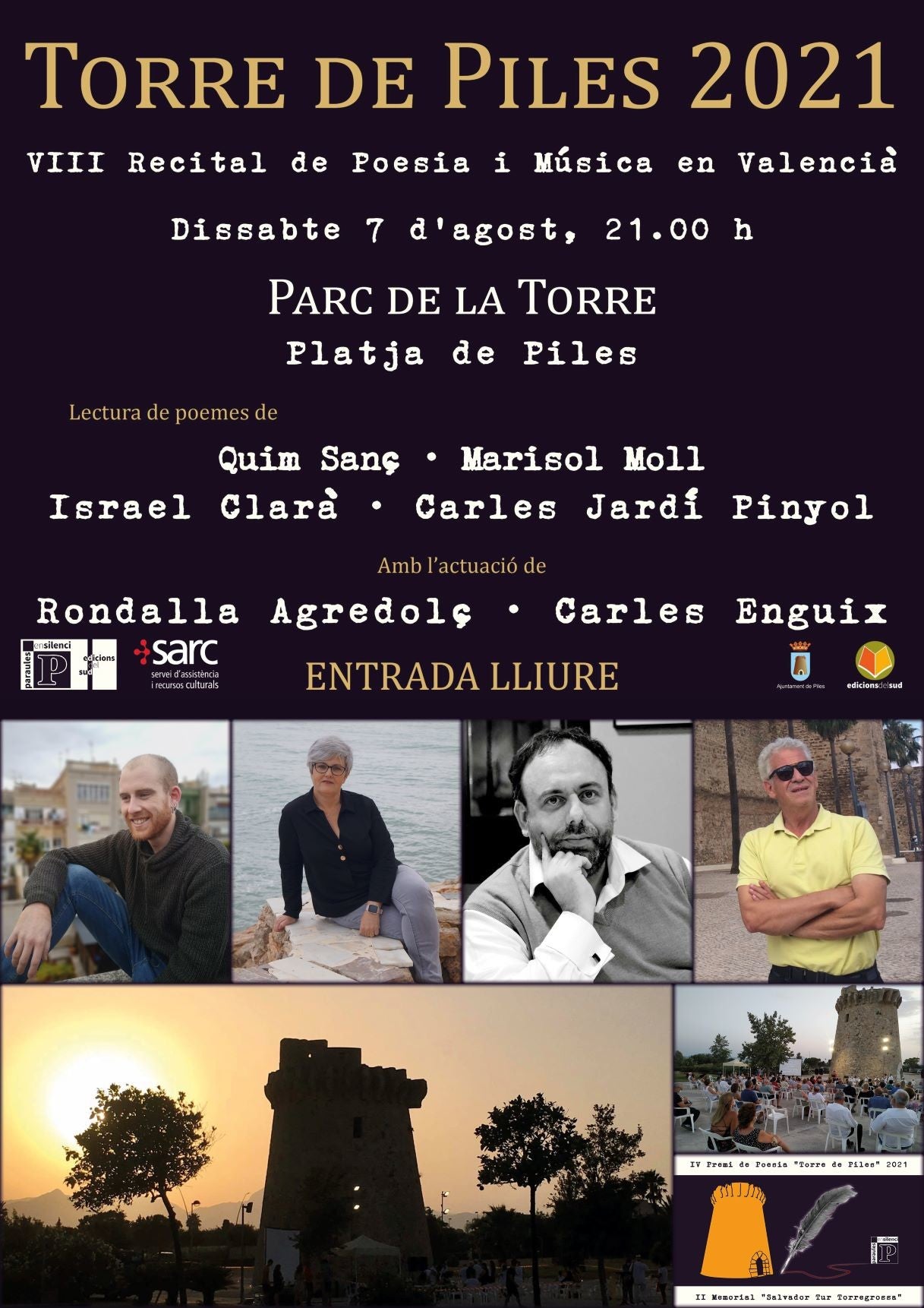 El parc de la Torre de Piles acull el dissabte 7 d’agost, a partir de les 21 h, el VIII Recital de Poesia i Música en Valencià, que organitzen l’editorial saforenca Edicions del Sud i l’Ajuntament de Piles. L’acte d’enguany serà el segon que retrà homenatge al piler Salvador Tur Torregrossa, qui va participar en el recital des de la seua fundació i qui va faltar l’agost de 2019, just la mateixa vespra de la celebració de la sisena edició.
