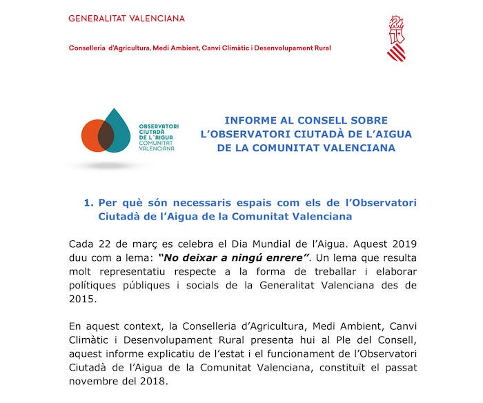 Segons ha informat l’entitat, «el 8 de novembre del 2018, en la passada legislatura, va tindre lloc la Jornada d’Inici de l’Observatori Ciutadà de l’Aigua amb l’obertura per part de la consellera Elena Cebrián i amb distintes ponències, com ara la presentada per la presidenta de L’Observatoire parisien de l’eau, Graciela Schneier-Madanes, entre altres, i la participació de representants de nombroses organitzacions relacionades amb l’aigua i els drets humans».